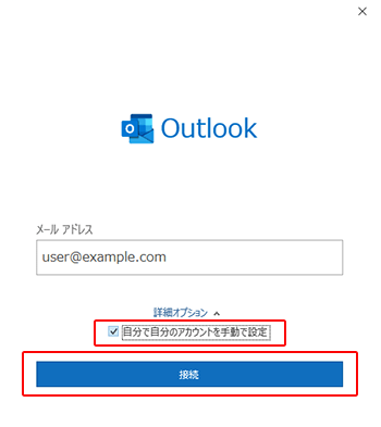 「自分で自分のアカウントを手動で設定」にチェックを入れ、接続ボタンを押してください。