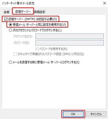 「送信サーバー(SMTP)は認証が必要(O)」と、「受信メールサーバーと同じ設定を使用する(U)」の2か所にチェックが入っていることを確認し、「OK」をクリックします。