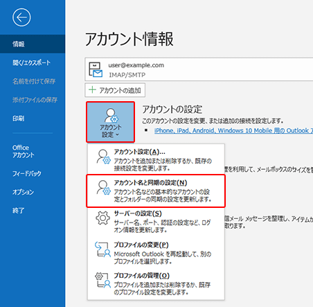 「アカウント設定」のメニュー内にある、「アカウント名と同期の設定(N)」をクリックします。