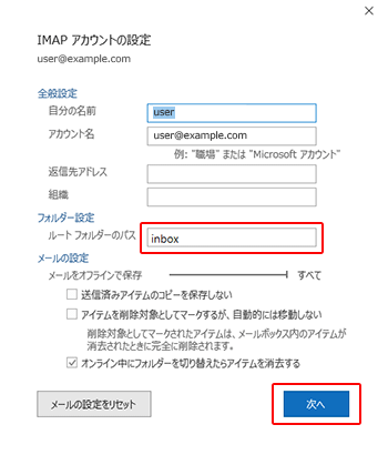 「フォルダー設定」の「ルートフォルダーのパス」に『inbox』と入力し、「次へ」をクリックして画面を閉じてください。