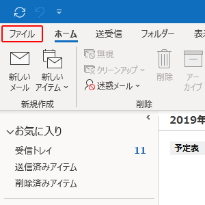 Outlookを立ち上げ、「ファイル」をクリックします。。