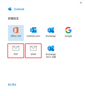 アカウントの種類を「POP」もしくは「IMAP」をクリックします。