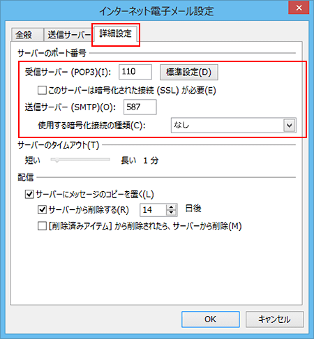 2.「インターネット電子メール設定」画面の「詳細設定」タブに進みます。