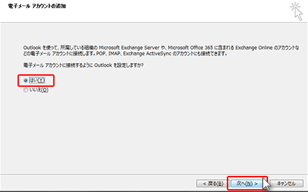 「Microsoft Outlook アカウントの設定」画面で「はい(Y)」を選択し、「次へ(N)」をクリックします。